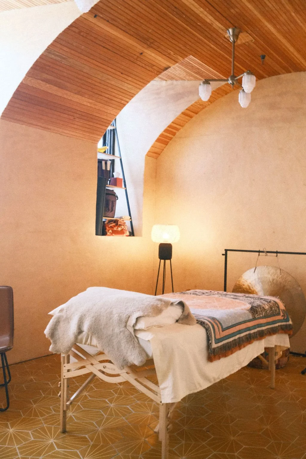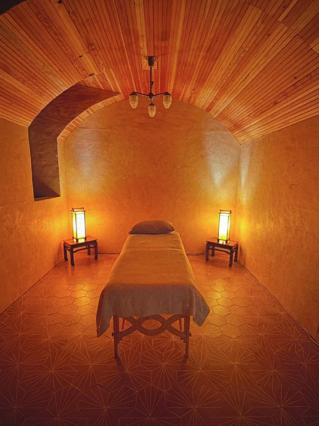 The Beeswax Room is a one-of-a-kind sacred space—its walls and ceiling hand-painted with over 570 pounds of local beeswax, radiating a subtle honey-scented warmth. Gold heated hexagon tiles underfoot create a cocooning, luminous atmosphere unlike any other.
